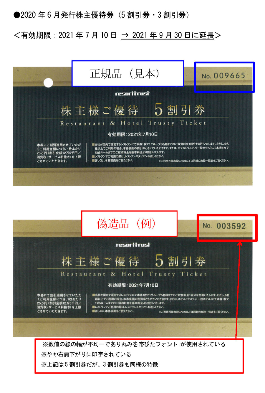 当社株主優待券の一部偽造品の特徴について