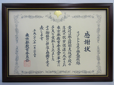 リゾートトラストは、平成27年度「東京都教育委員会事業貢献企業」にて、都立特別支援学校の就労促進に貢献したとして評価されました。